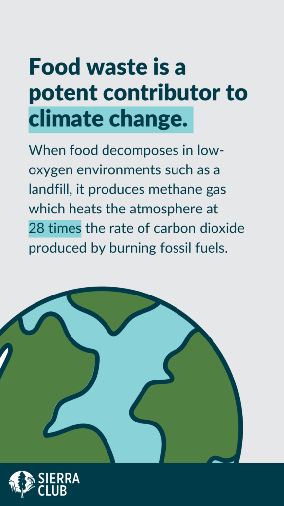 Six Instagram story slides were created to be posted on the Sierra Club’s Instagram. Taking content from the blog post above, the slides highlight the scale and impacts of the food waste crisis, the value of composting, and how Californians can reduce their food waste through a new state program.