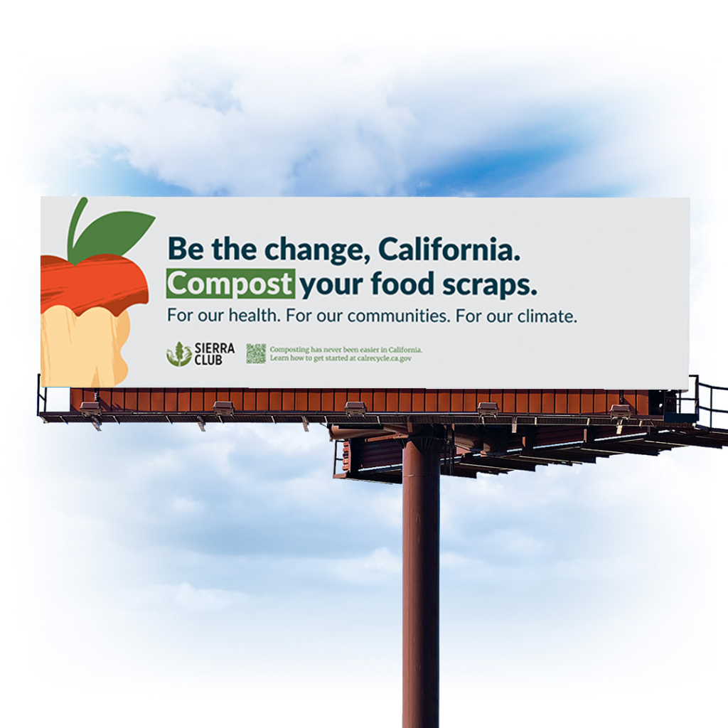 One billboard (14′ H x 48′ W) was created centered around the message “Be the change, California,” intending to evoke a sense of collective ownership for the food waste crisis. The high-level call-to-action of being the change through composting is accompanied by a QR code and link to CalRecycle’s website where California residents can learn how to start composting through local programs.